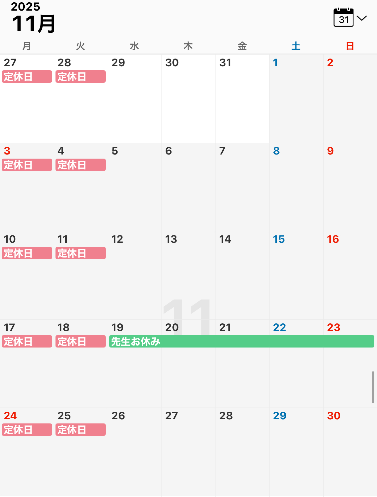 11月定休日のお知らせ